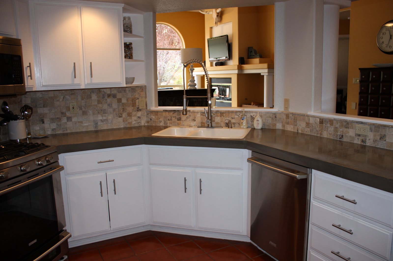 Then we did the countertops: My husband made forms around the existing countertops. We sanded the tile so the concrete would have something to grab on to. Then he poured concrete over the top of them The concrete leveled itself out. Removed the forms, and my husband smoothed it out. Now, we have done several concrete countertops before, and have removed the old countertop and poured a whole new one. This was an experiment to pour concrete over the top of existing countertops. And I must say, it has worked out so far! There are a couple cracks, but ALL concrete cracks. Gives it character. Just wait for it to be done curing, then we put a coat of concrete sealer over the top and heres what they look like now:Super gorgeous. And it was cheap, and fast-about $ 200 for a new countertop!! Then we had the ugly backsplash, remember?So here it is all put together... I am thinking a rug in here too....any suggestions? New appliances- Craigslist $ 2500 New faucet- Ebay $ 100 We decided not to stain this countertop, we just left the concrete as is, and it came out with a beautiful color and finish. So there is my big reveal! Hope you enjoyed it. Keep checking in, there is a lot of adding and tweeking to be done!